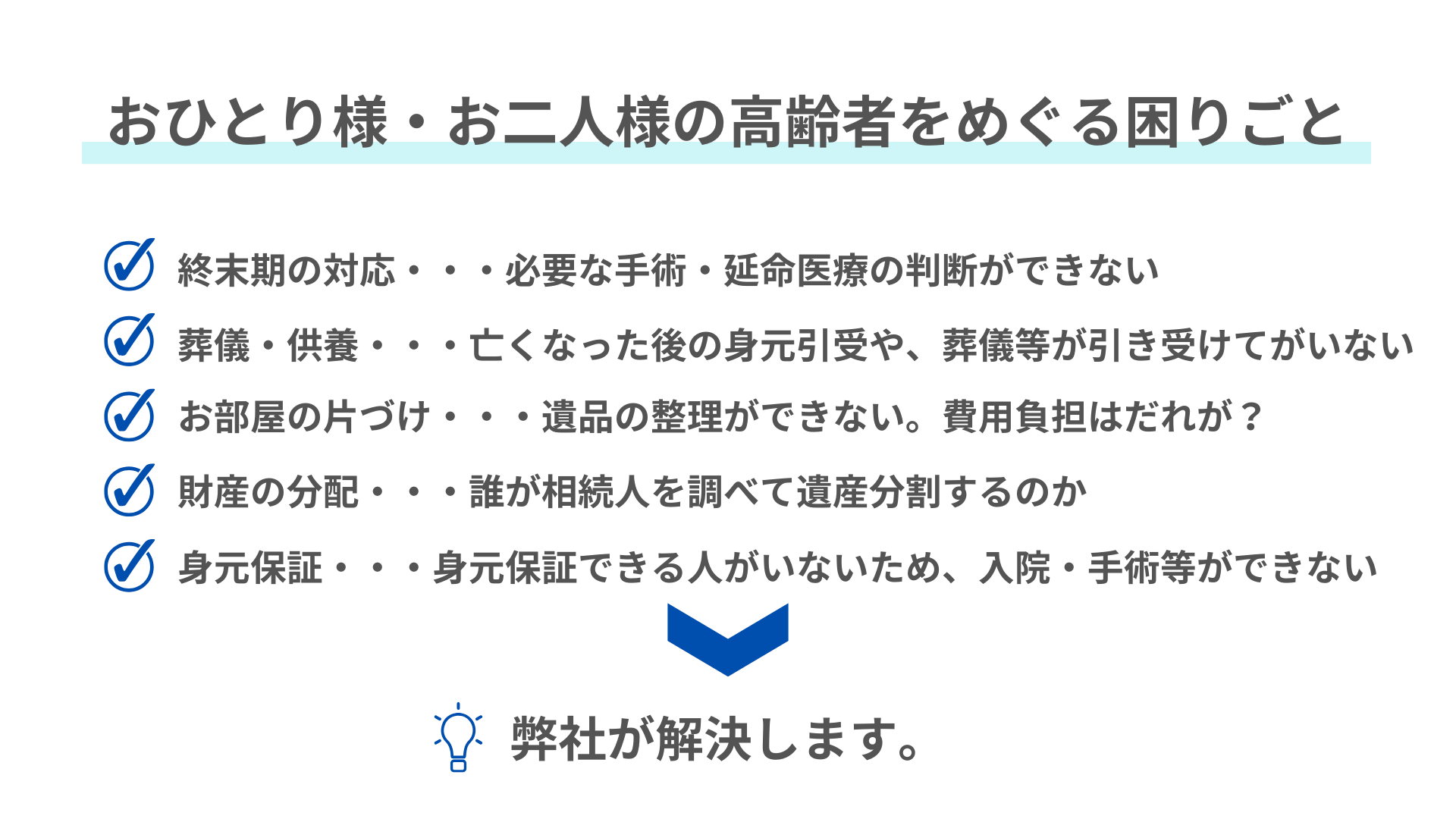 老後、介護、入院、相続…だからこそ、(遠方や疎遠の)子どもに相談しにくい…、親族がいない。