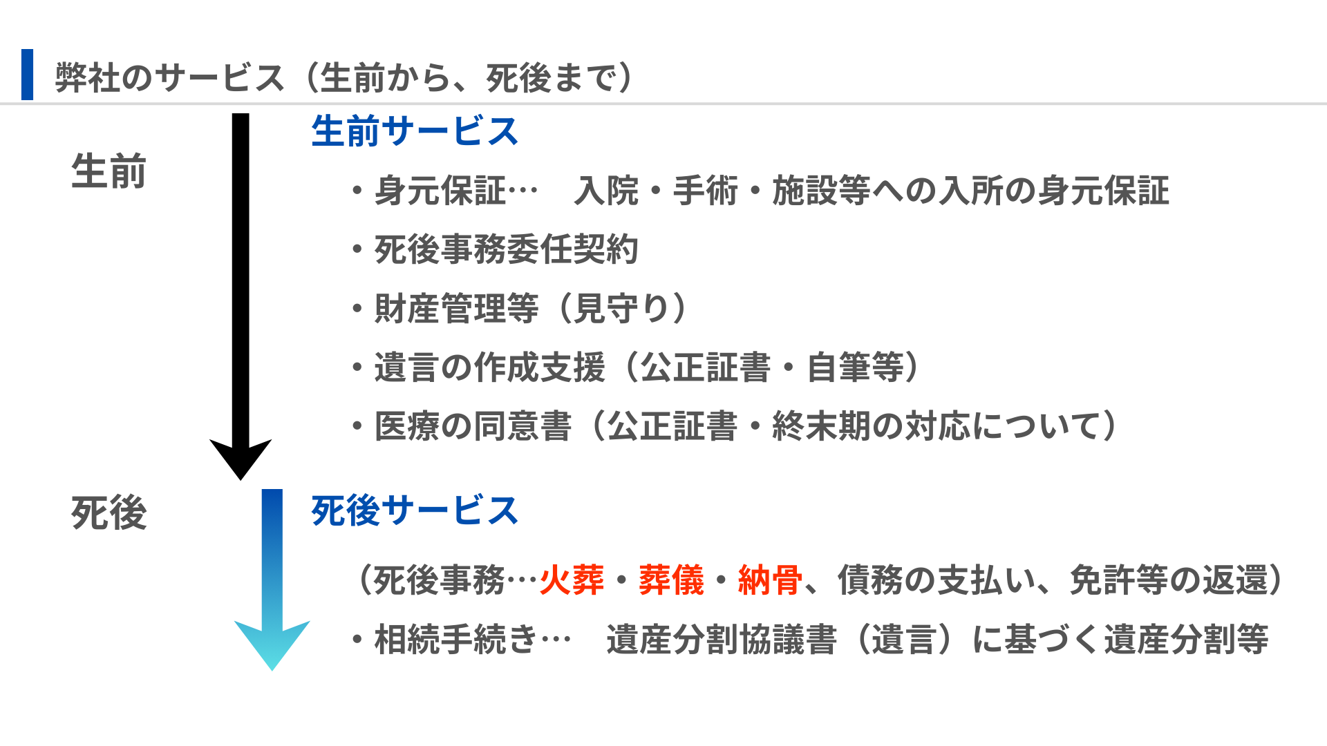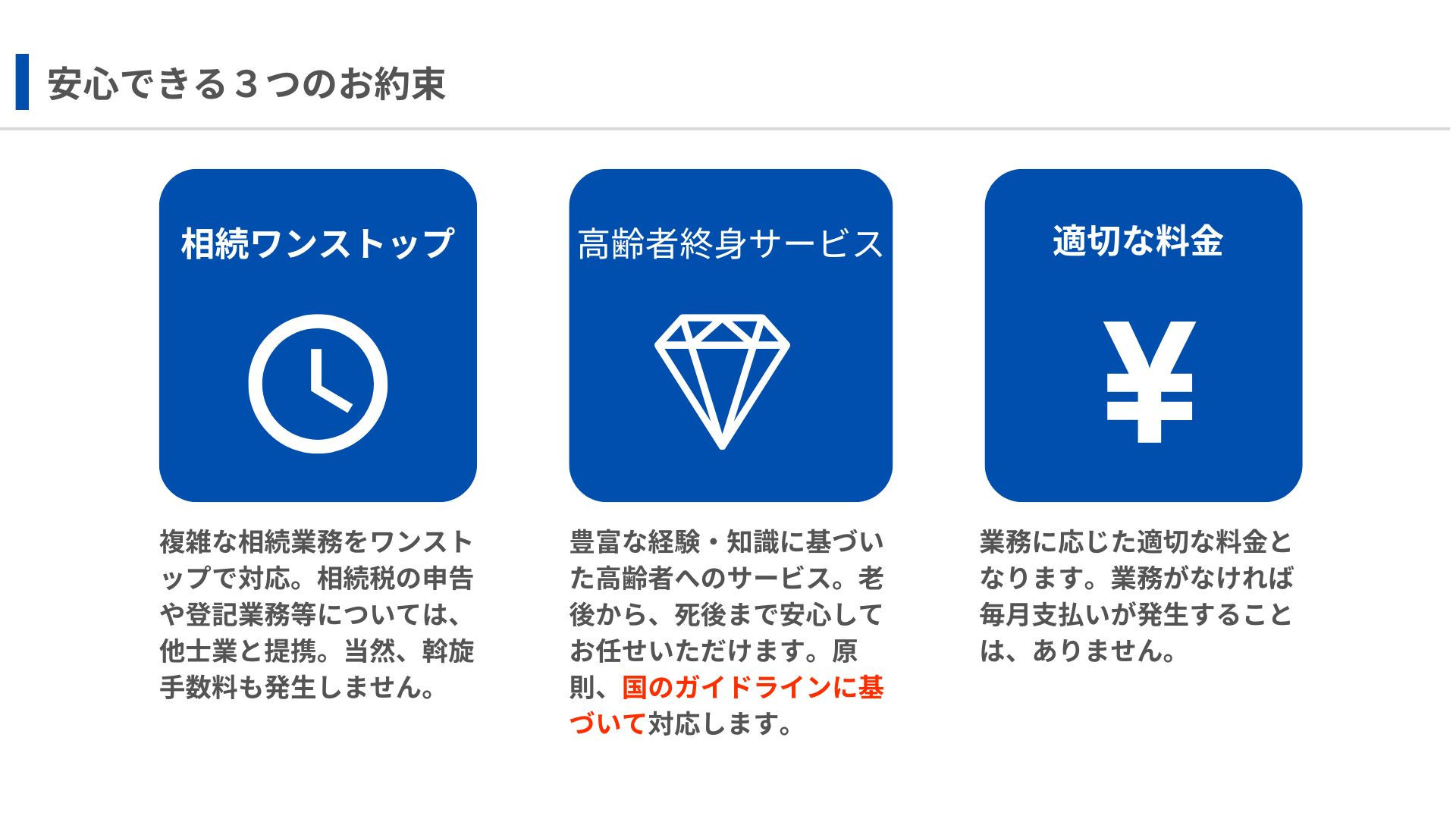 弊社は、相続・遺言・高齢者サービスを専門として、安心して老後を過ごすことができる価値を提供しています。弊社では、原則、高齢者等終身サービス事業者ガイドライン(内閣府 孤独・孤立対策推進室 令和6年)に沿って、対応しています。